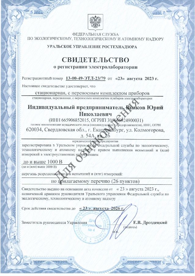 По результатам испытаний и измерений составляется технический отчет установленного образца для предъявления инспектору Ростехнадзора, Пожарной инспекции и другим органам контроля в сфере электробезопасности в период очередной проверки для подтверждения соответствия вашего предприятия всем требованиям, предъявляемым к содержанию электроустановок действующих на территории РФ.